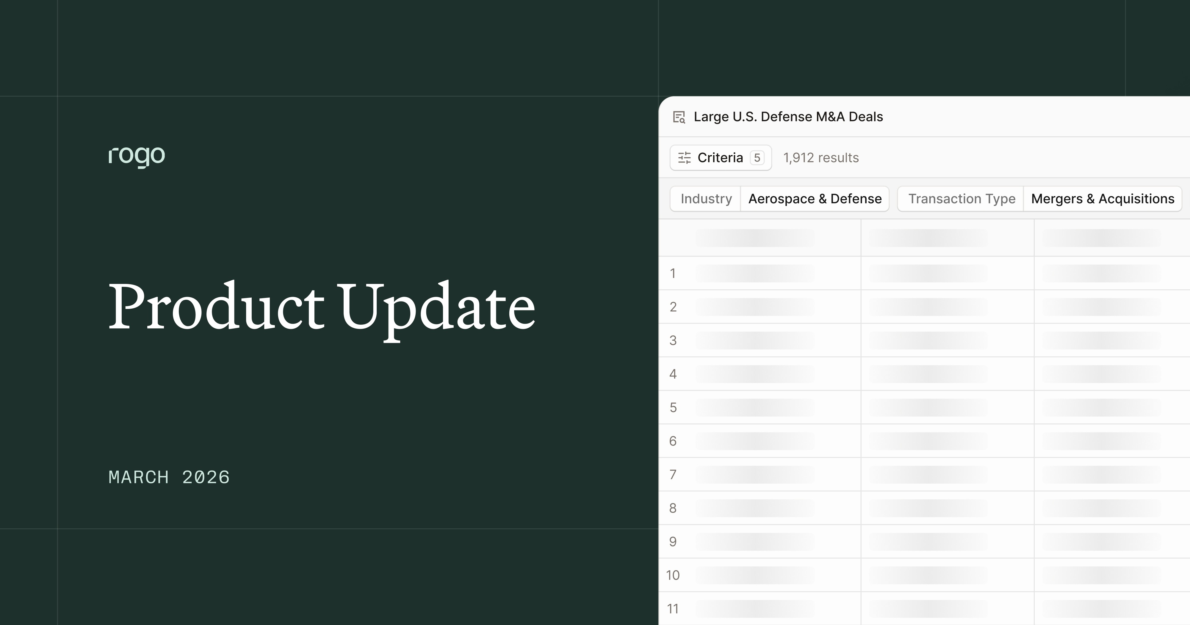 Screenings are Rogo’s deterministic capability for systematically surfacing companies, transactions, and Crunchbase data at scale. Built directly on top of structured data, screenings allow you to pull highly reliable information across public and private companies, transaction datasets, financial metrics, valuation data, and more.
