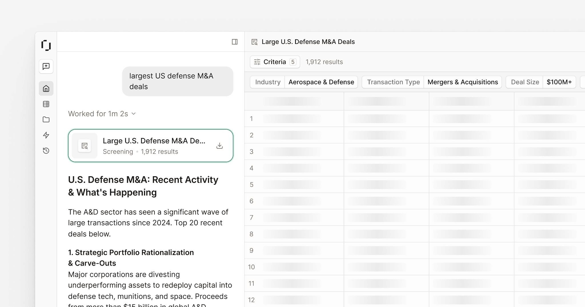 Screenings: Deterministic screening across structured data to surface companies, transactions, and market insights at scale